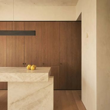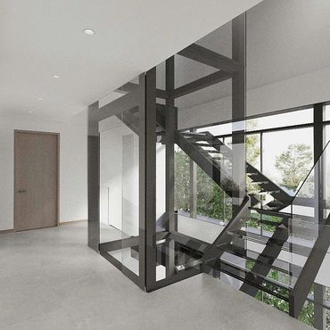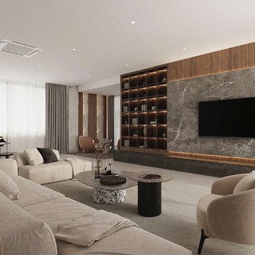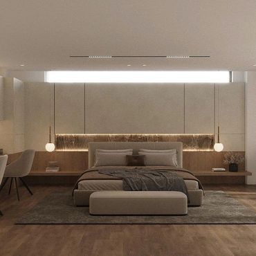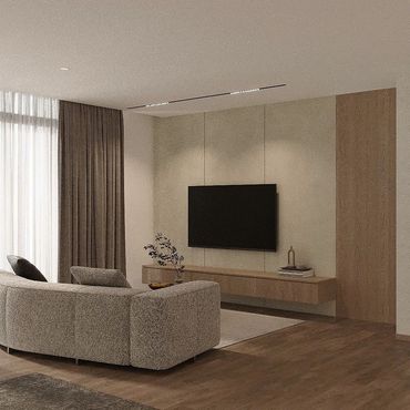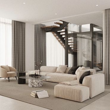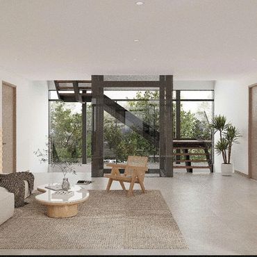 Upon entering, residents are greeted by a sophisticated, airy atmosphere. The grey textured walls provide a sense of refined elegance, while large windows and doors allow ample natural light to flow through the interiors, enhancing the sense of openness and connection to the outdoors.