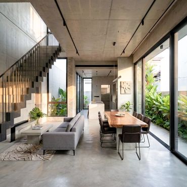 Vee Terrace is a contemporary two-storey plus attic landed residence in Singapore, conceived as a sculptural composition defined by exposed concrete and natural textures. The architecture emphasizes material honesty, depth, and proportion, with solid and void carefully balanced to create a calm yet expressive form.